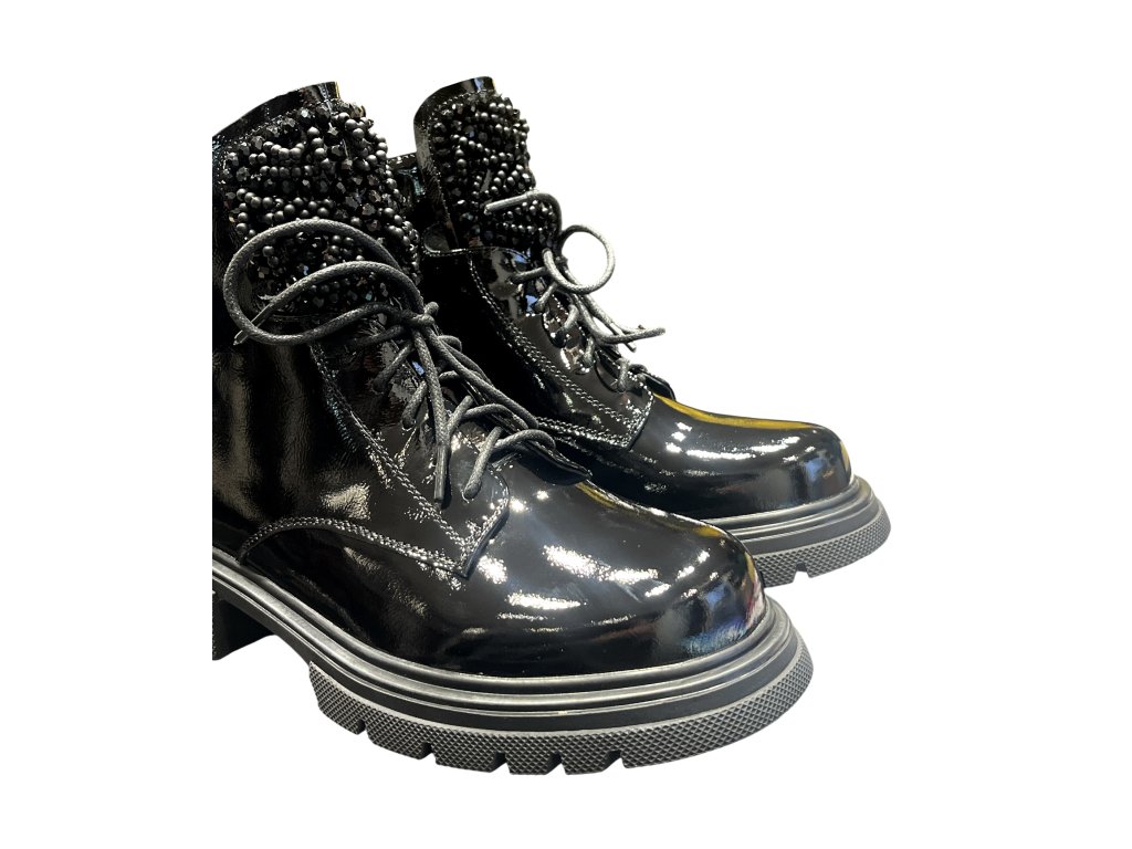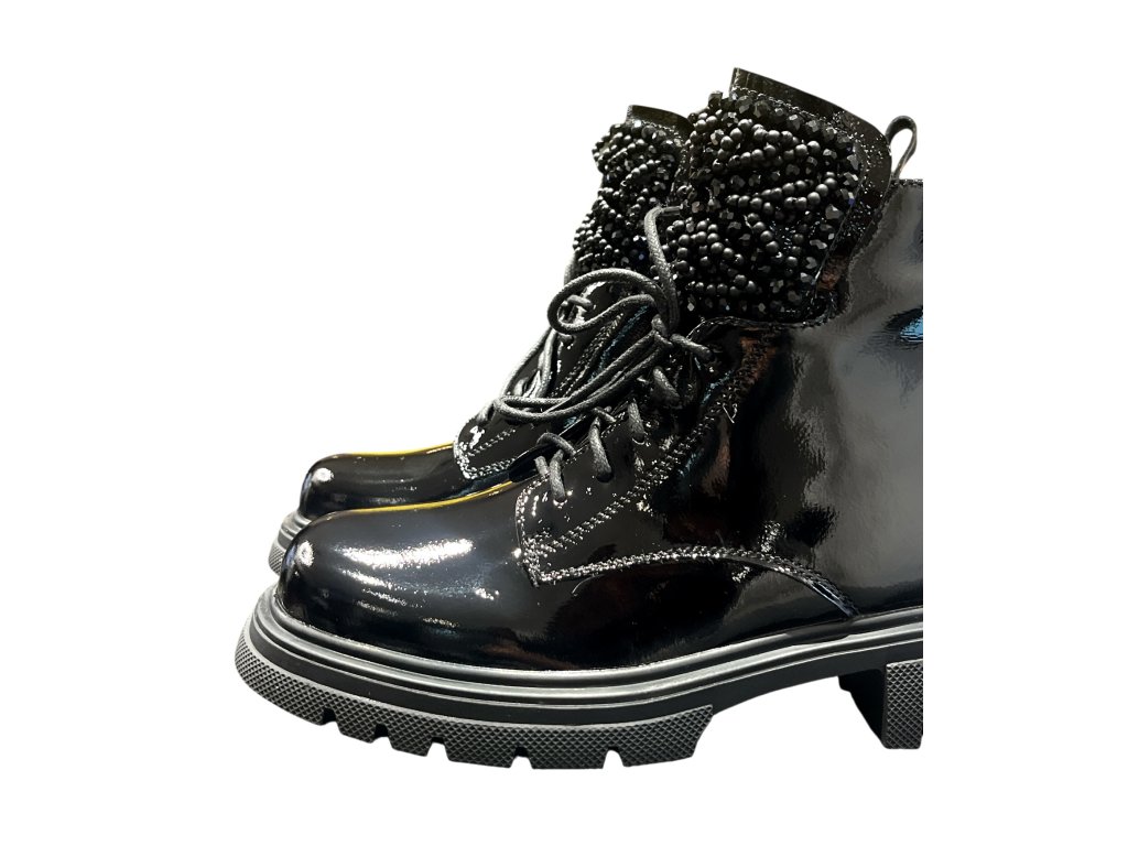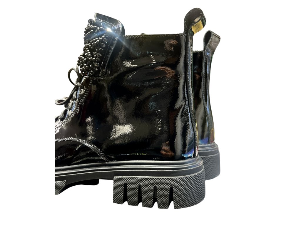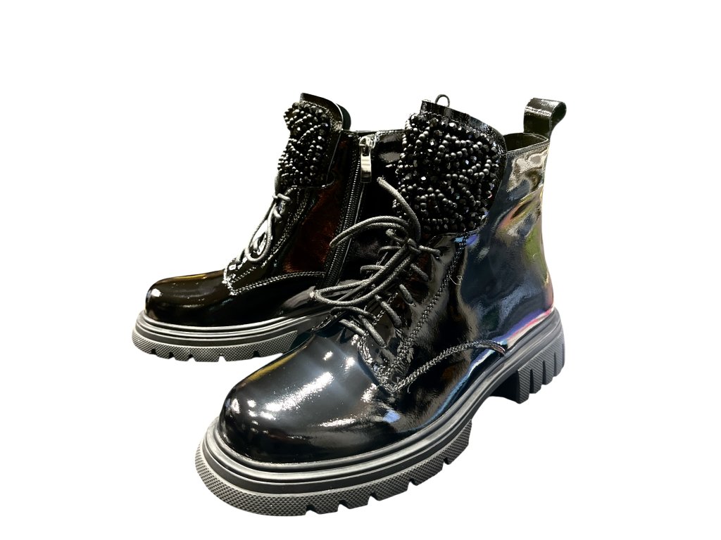 Dámské kotníkové boty Ladies v černé barvě v lakované kůži s hrubší podešví. Botky jsou ideální na pochůzky po městě. Využít je můžete k šatům nebo kalhotám. Působí luxusním originálním dojmem, i díky korálkům ve vrchní části botky. Doplněny jsou tkaničkami, kterými si je přizpůsobíte sobě na míru. Navíc určitě oceníte měkký došlap do paměťové pěny na stélce.