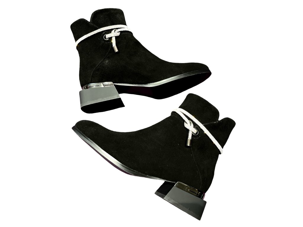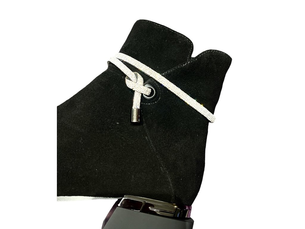 barva černá, broušená kůže, stříbrný ozdobný pásek okolo kotníku