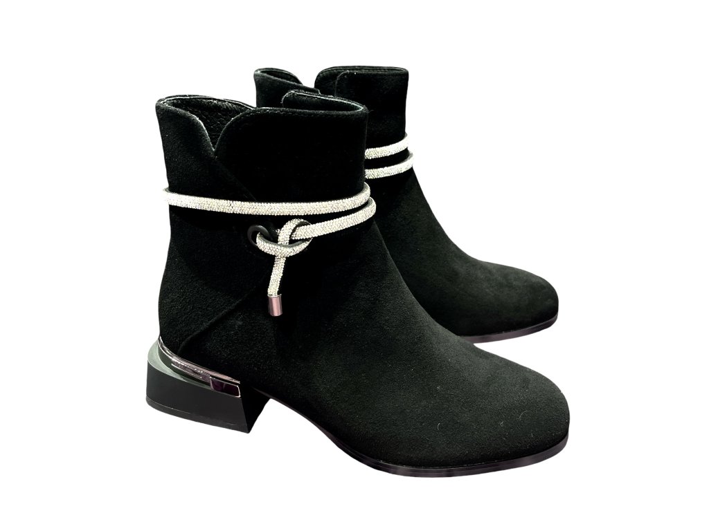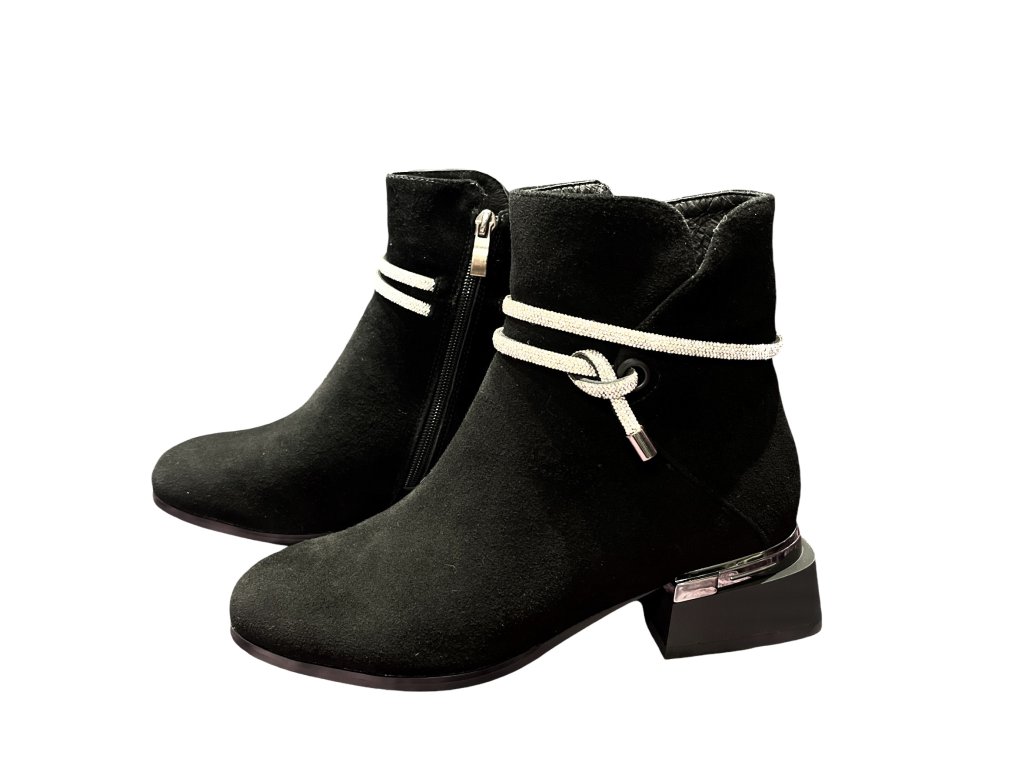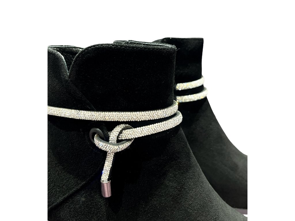 Dámské kotníkové boty české značky Ladies, v černé barvě, z broušené kůže. Nádherné "kotníčky", které budou skvělým doplňkem k šatům, sukním nebo elegantním kalhotám. Kolem kotníku jsou orámovány kamínkovým páskem, detailem, který z klasických černých kotníkových bot vytvořil naprosto originální a exkluzivní model.