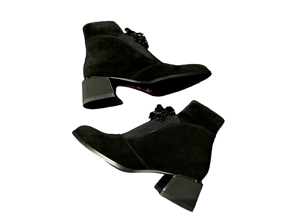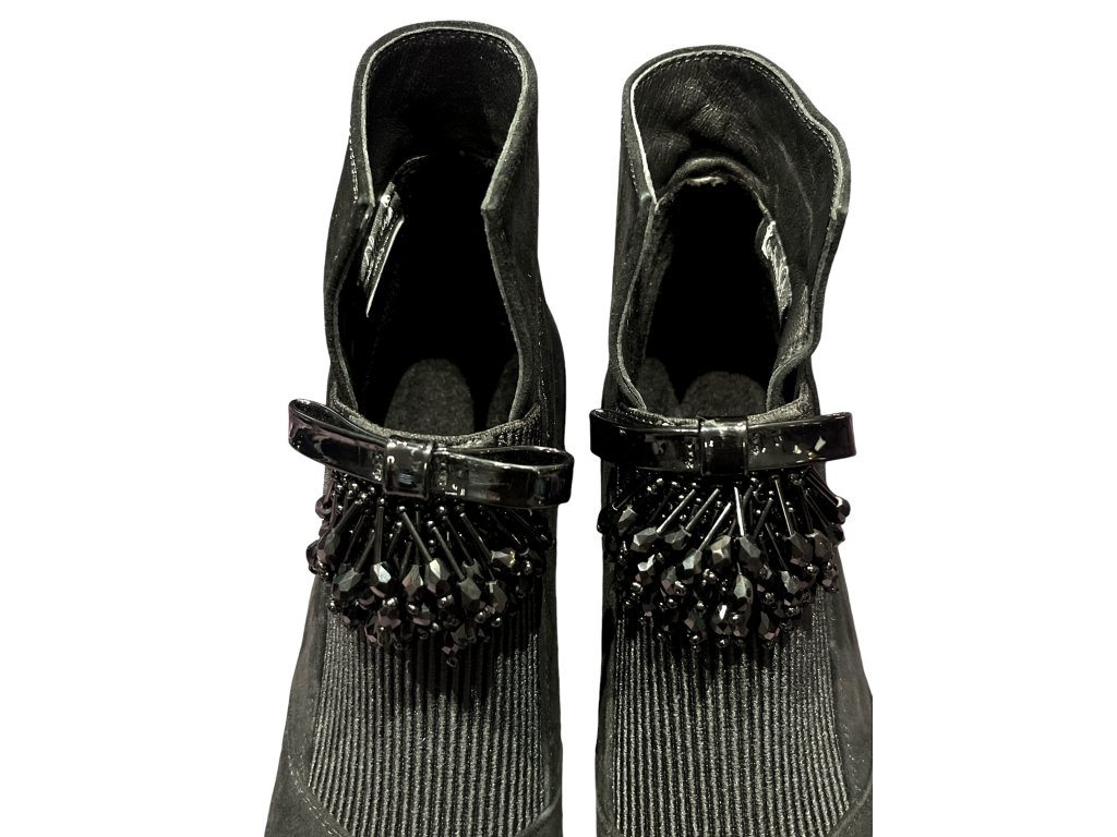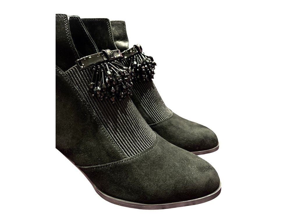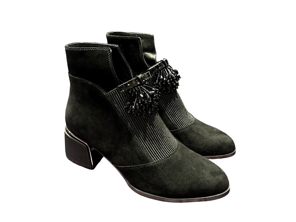 Dámské kotníkové boty české značky Ladies, v černé barvě z broušené kůže. Krásný elegantní model, který skvěle doplní Váš outfit, ať už je vezmete k šatům, sukním, nebo ke kalhotám. Nártová část je ozvláštněna visícími korálky, které zefektní celkový vzhled botek.