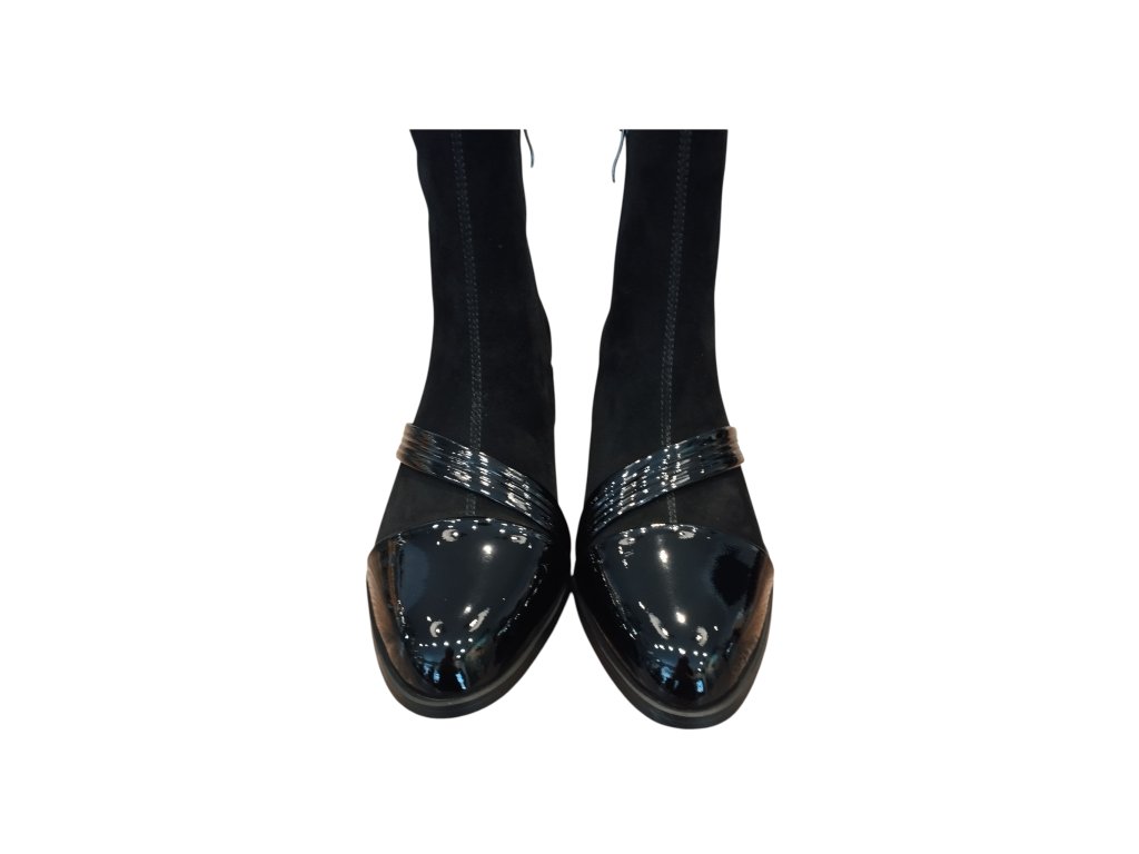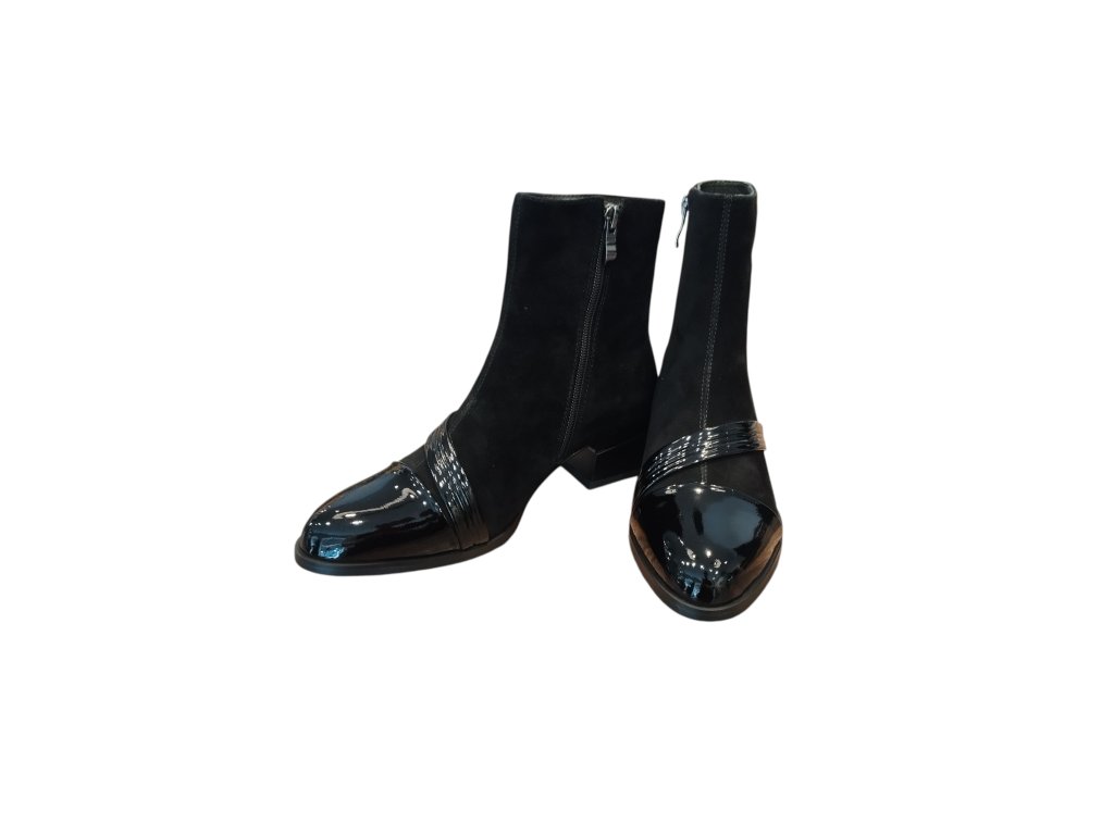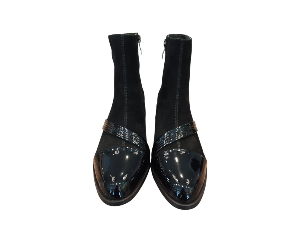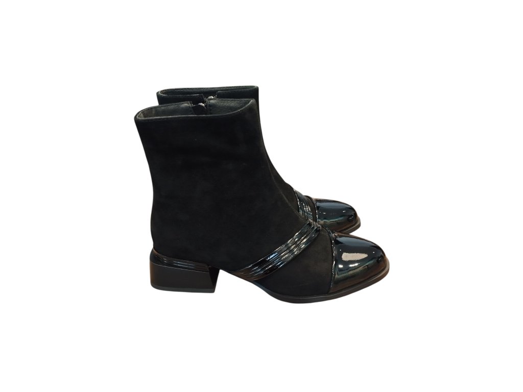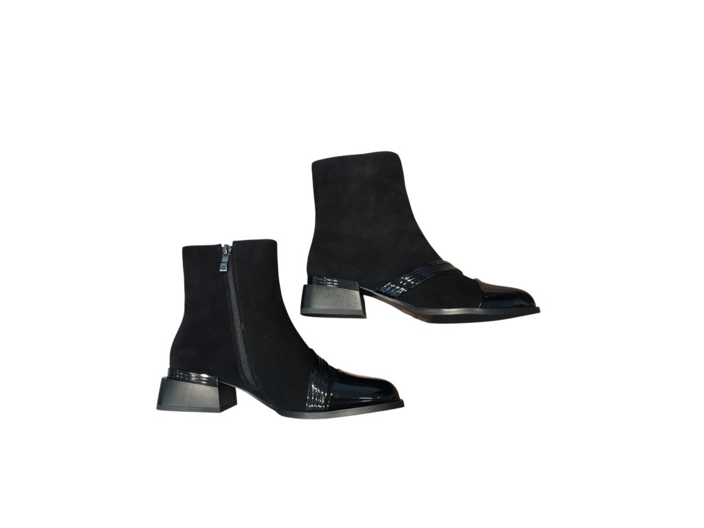 Ladies kotníkové boty černé v broušené kůži kombinované s lakem