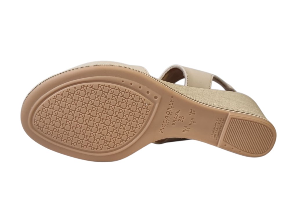 Dámské sandály brazilské značky Piccadilly vás okouzlí svým moderním designem a pohodlím při chůzi. Jsou ideální volbou pro letní dny, ať už vyrazíte do města, na dovolenou nebo do práce. Syntetický svršek vkusně doplňuje překřížený pásek přes nárt, který plynule přechází do gumy kolem paty – ta je navíc obšitá, takže drží pevně, ale neřeže. Klínový podpatek dodá výšku i eleganci, přitom zůstává stabilní a komfortní. Měkká stélka, lehká konstrukce a pružné materiály zajišťují příjemný pocit po celý den – i při delší chůzi. Snadné nazouvání dělá z tohoto modelu spolehlivého společníka pro horké letní dny.