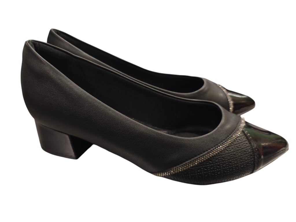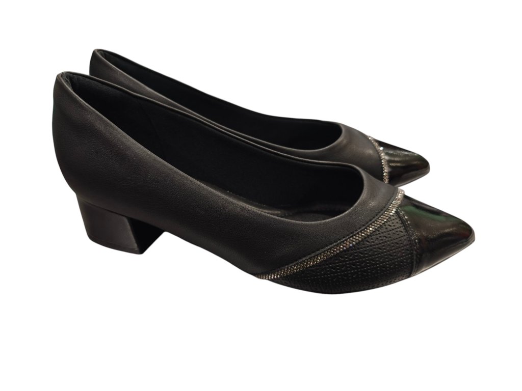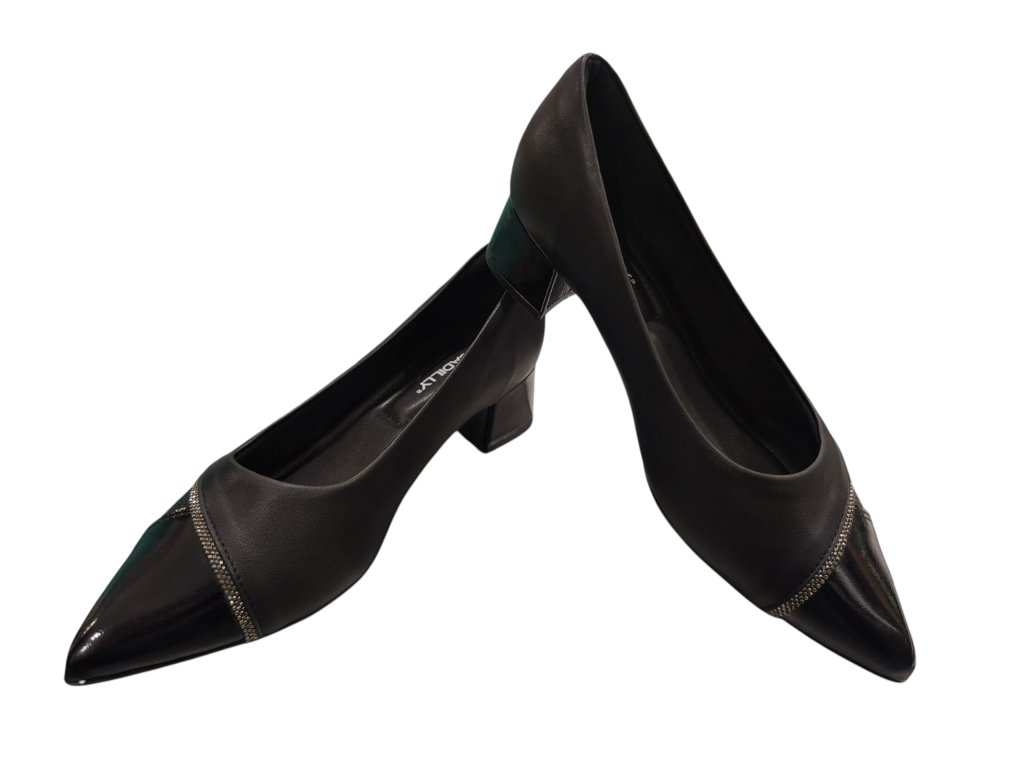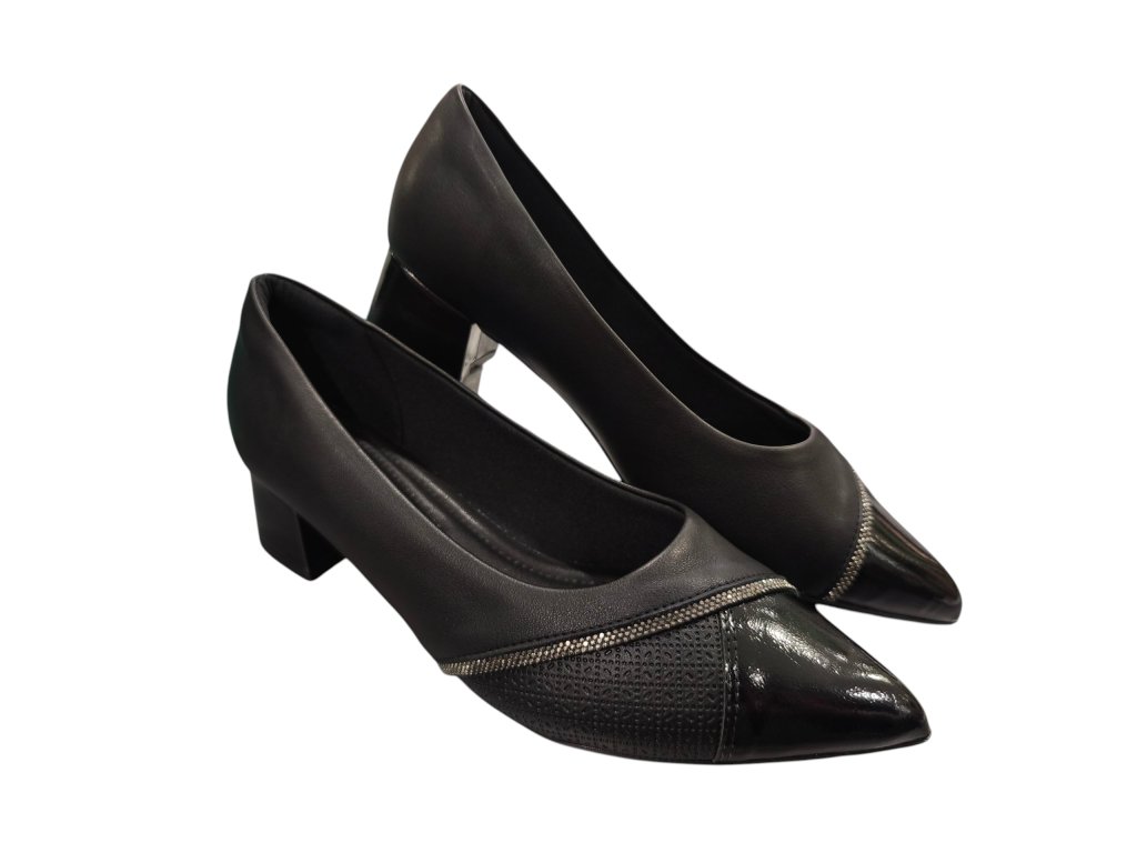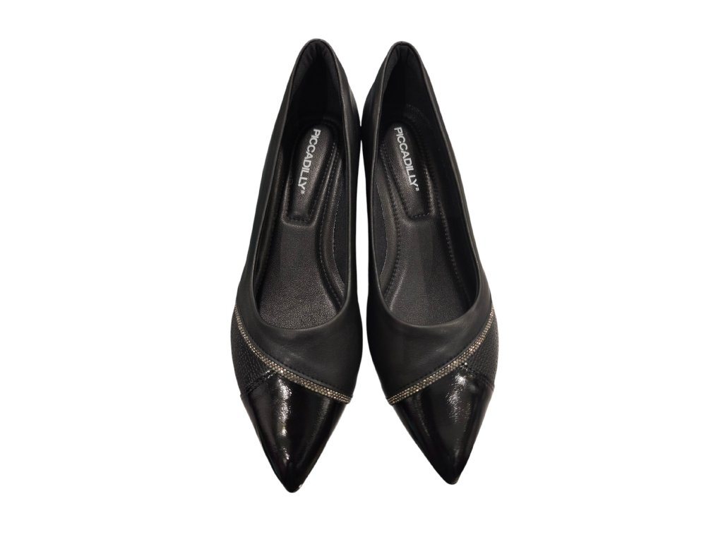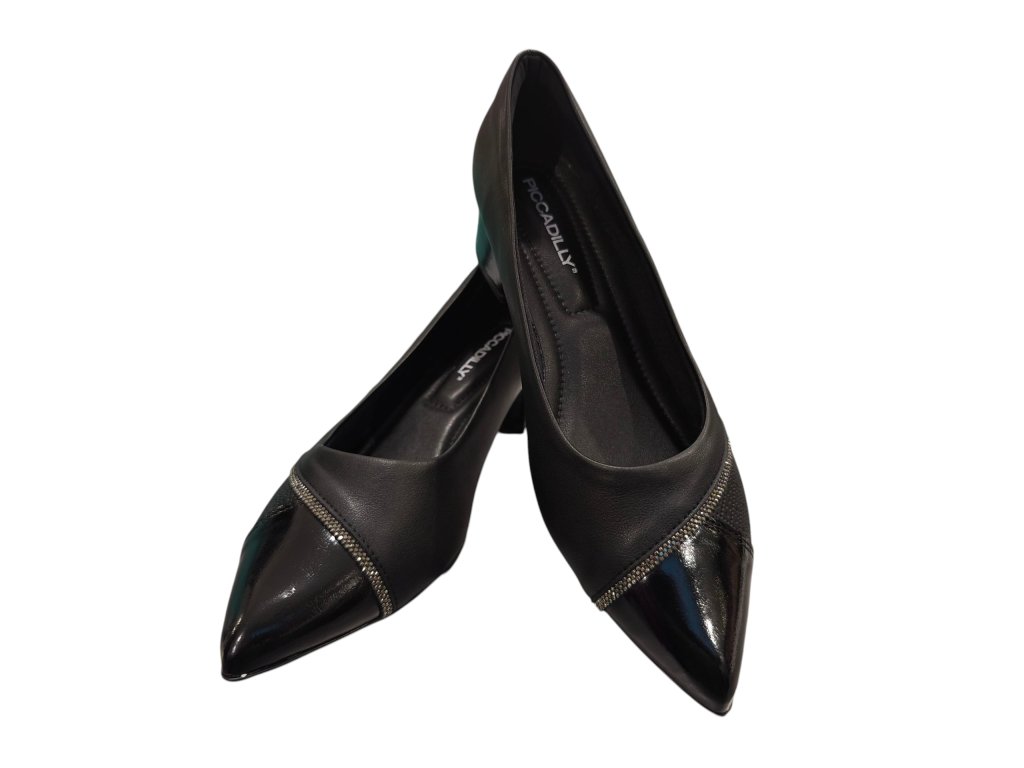 Dámské lodičky Piccadilly černé, kombinované s lakovanou špičkou a ozvláštněné stříbrným štrasovým proužkem. Mají ideální výšku podpatku pro běžné nošení, ale rozhodně se Vám budou hodit i do divadla či na ples . Působí exkluzivně, navíc jsou neskutečně pohodlné a vhodné i pro halluxy. Jsou tak výbornou volbou, pokud potřebujete v lodičkách vydržet i celý den. Doporučujeme vyzkoušet!