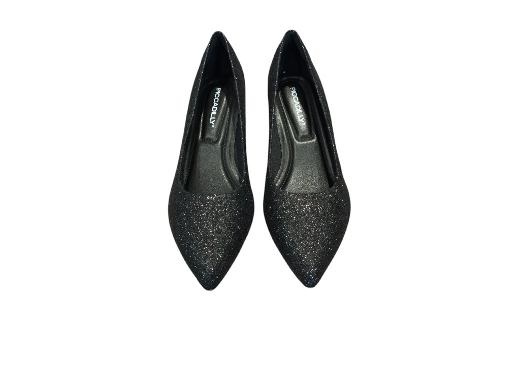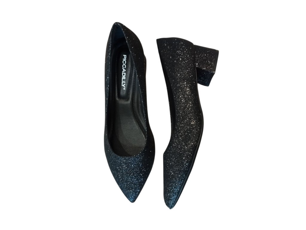 Dámské lodičky Piccadilly, černé třpytivé. Na nízkém podpatku, do špičky. Působí elegantně a krásně Vám prodlouží nožky. Zároveň Vám ale zajistí pohodlí, případně i po celou noc, kterou se rozhodnete protancovat. Určitě si je užijete do divadla, na plesy či jiné společenské akce. Ale dodají šmrnc každému Vašemu outfitu, vhodnému třeba na rande či obchodní schůzku.