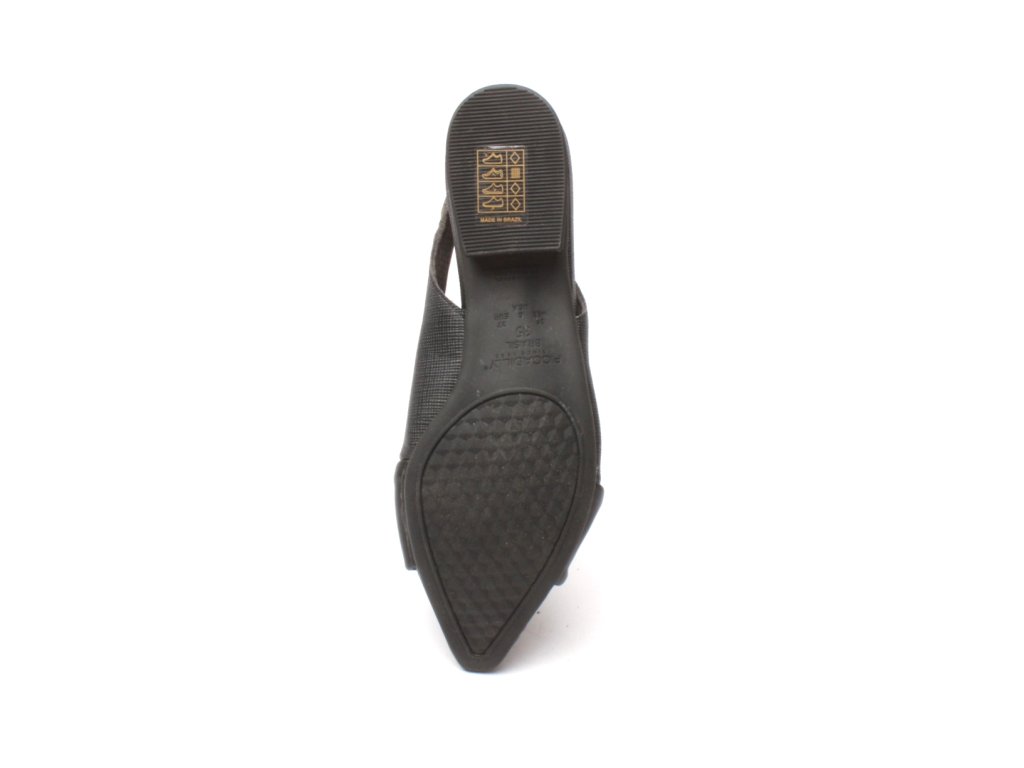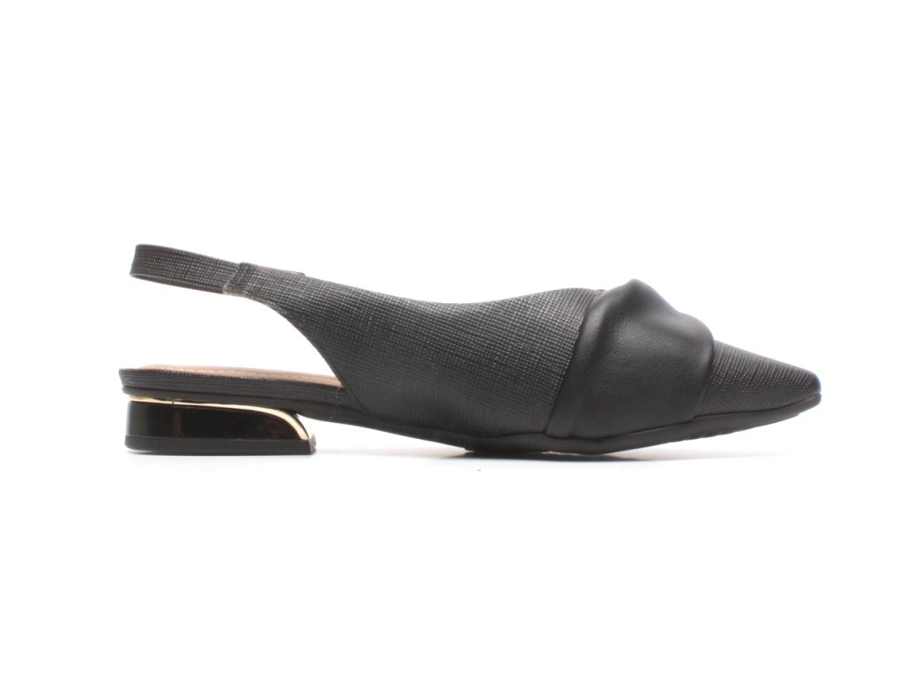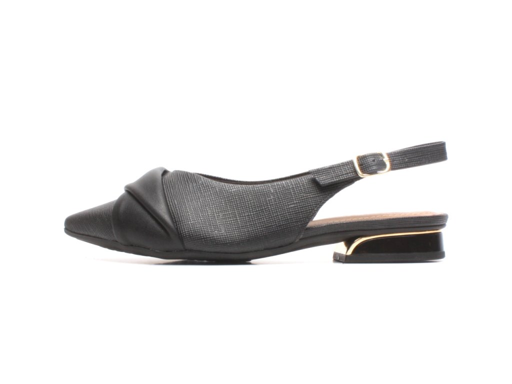 Černé střevíce s otevřenou patou a ozdobou na špičce.